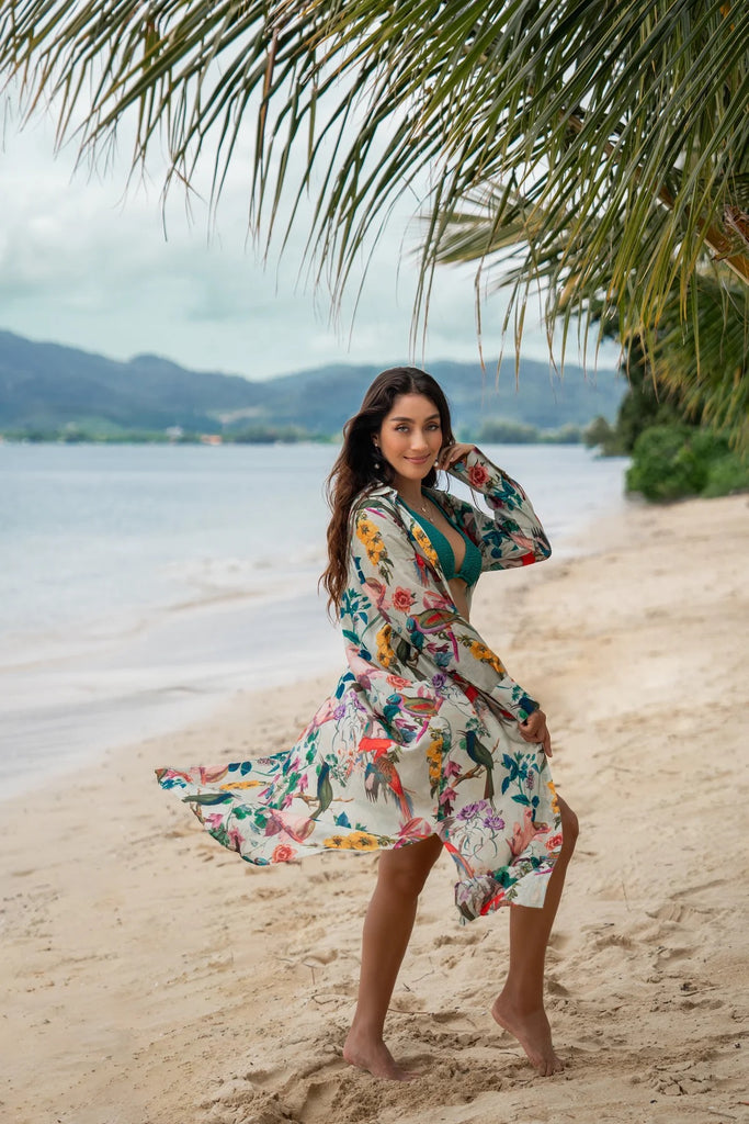 Kaanda Beach Life Shirt Dress i mönstret Hummingbird är gjord i 100 % viskos – ett mjukt, svalt och luftigt material som andas och faller vackert mot kroppen. Den smickrande skärningen framhäver figuren utan att sitta åt, så du slipper känslan av att “försvinna i ett tält”. Knapparna går hela vägen fram, vilket gör att du kan bära den både som klänning eller öppen över byxor och linne.