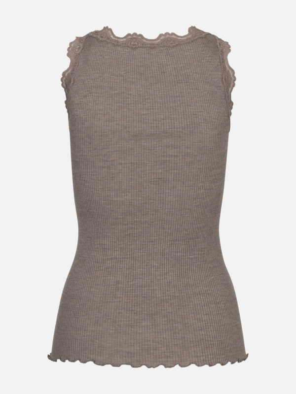 Rosemunde Classic silk top with lace är en favorit i vår butik. Den har ett vackert uttryck med fina detaljer. Toppen är feminin och är tillverkad i en mjuk silkesmix i en blandning av siden och bomull, vilket gör att den blir väldigt bekväm att ha mot kroppen. Spetsen är vackert lagd runt halsringningen och har en vacker frillkant längst ner, vilket kompletterar den vackra looken. Toppen har inga sömmar och är därför väldigt bekväm att bära både under en skjorta eller stickad tröja men också som en vanlig basöverdel.