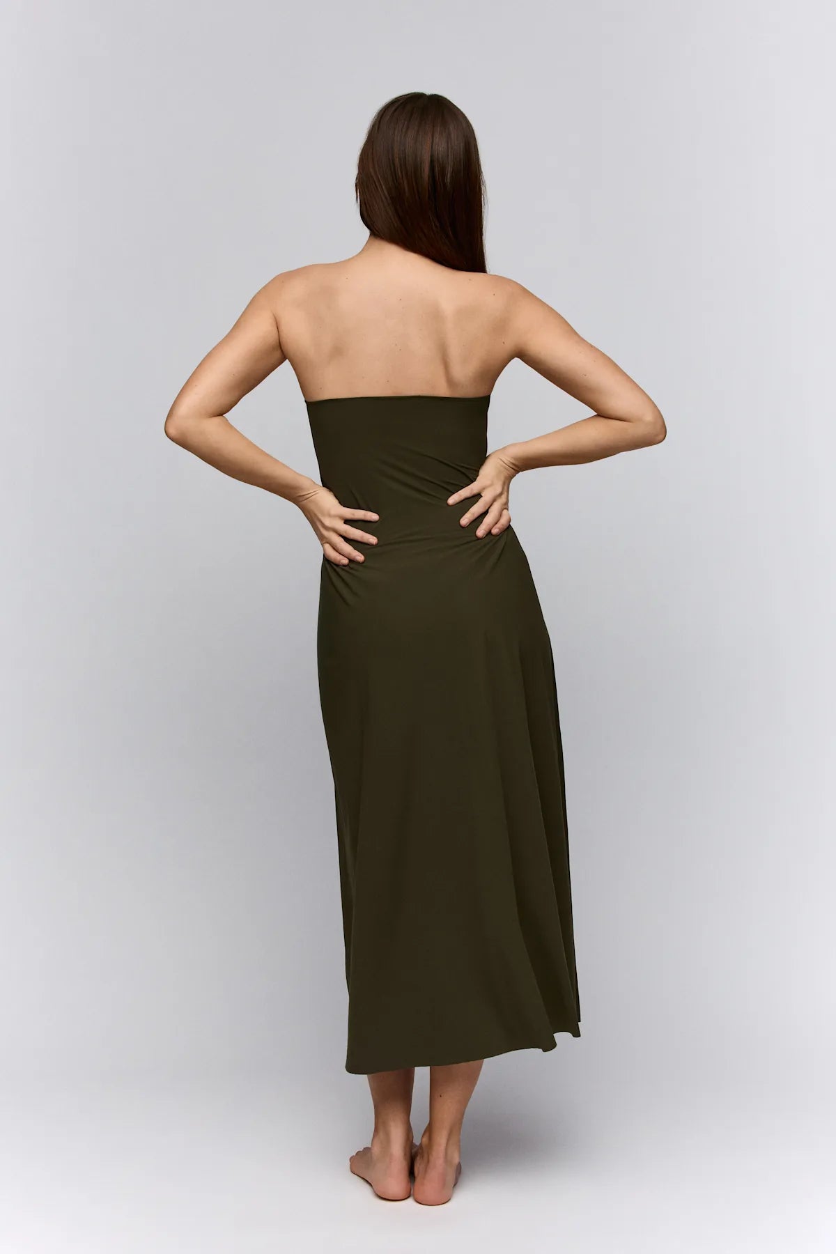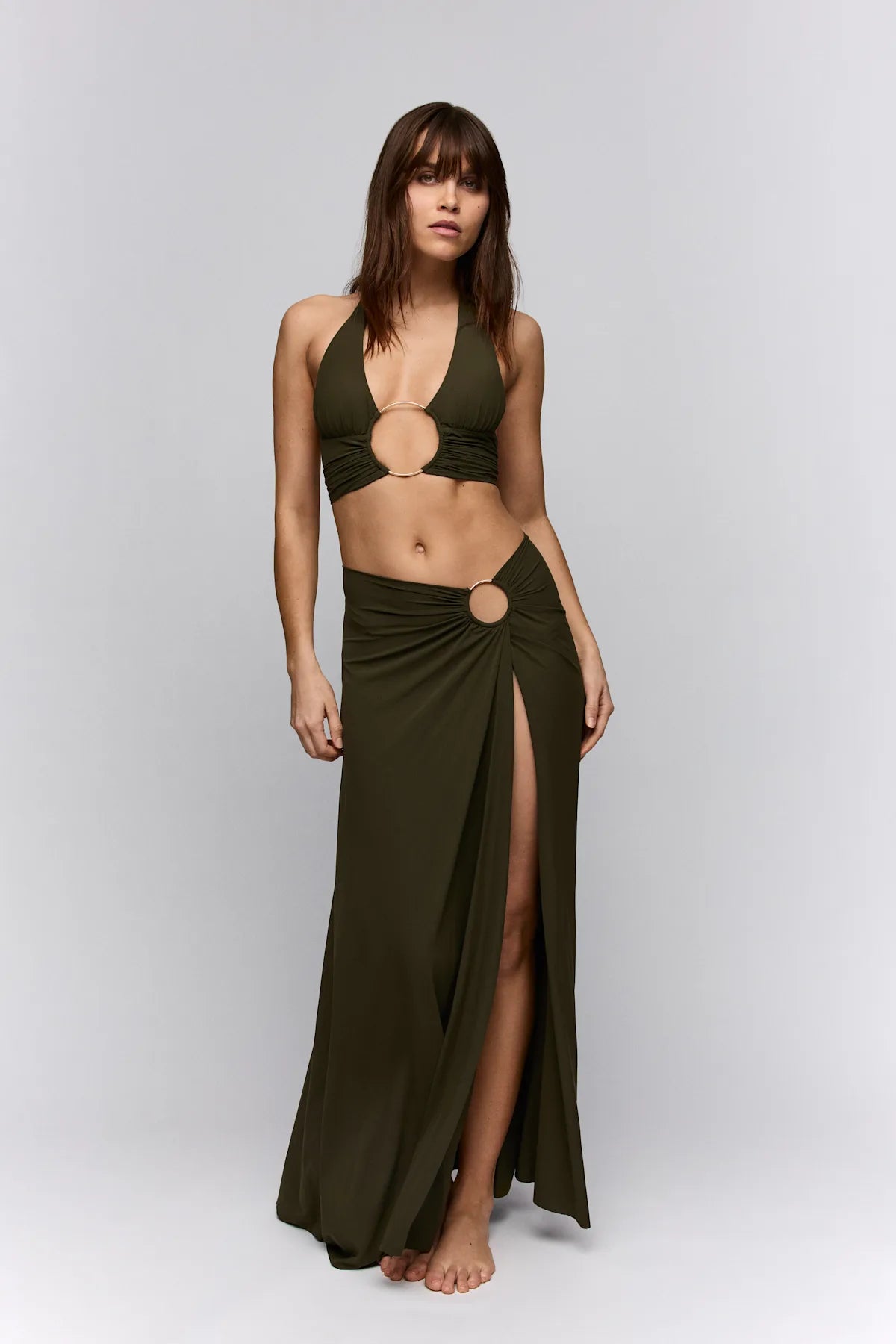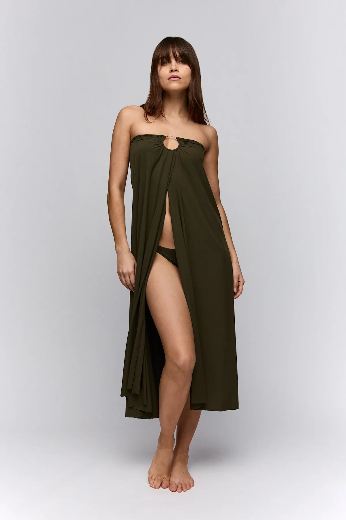 Ett smart, mångsidigt strandplagg som kan användas både som kjol och som strandklänning – perfekt när du vill ha en snabb, stilren omvandling utan att kompromissa med looken. Den svarta färgen gör den lätt att matcha, och snittet framhäver kroppen på ett smickrande sätt oavsett hur du bär den. Lätt, följsamt tyg som rör sig snyggt och känns bekvämt även i värme.